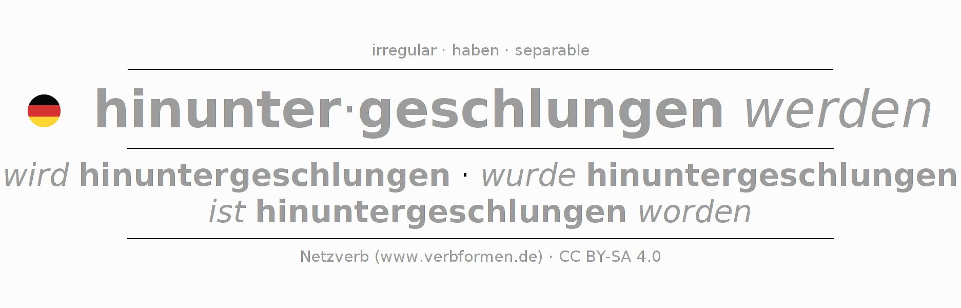 - Future: ich werde hinuntergeschlungen werden, du wirst hinuntergeschlungen werden, er wird hinuntergeschlungen werden, wir werden hinuntergeschlungen werden, ihr werdet hinuntergeschlungen werden, sie werden hinuntergeschlungen werden