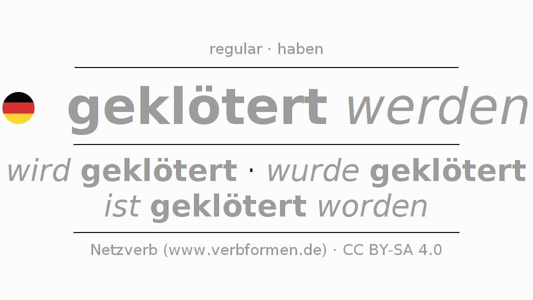 - Future: ich werde geklötert werden, du wirst geklötert werden, er wird geklötert werden, wir werden geklötert werden, ihr werdet geklötert werden, sie werden geklötert werden