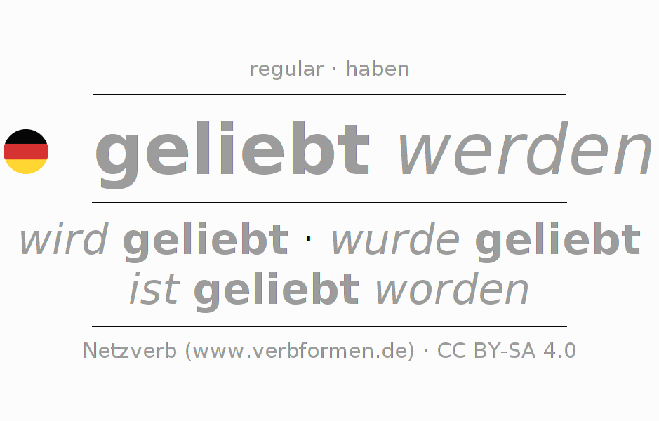 Clear online presentation of the verb 'geliebt werden' including all verb forms. Therfore, the flection of the verb geliebt werden can be useful for homework, tests, exams, German lessons in school, learning German, during studies and adult education. Especially for people learning German it is essential to know the correct flection of a verb (wird geliebt - wurde geliebt - ist geliebt worden).