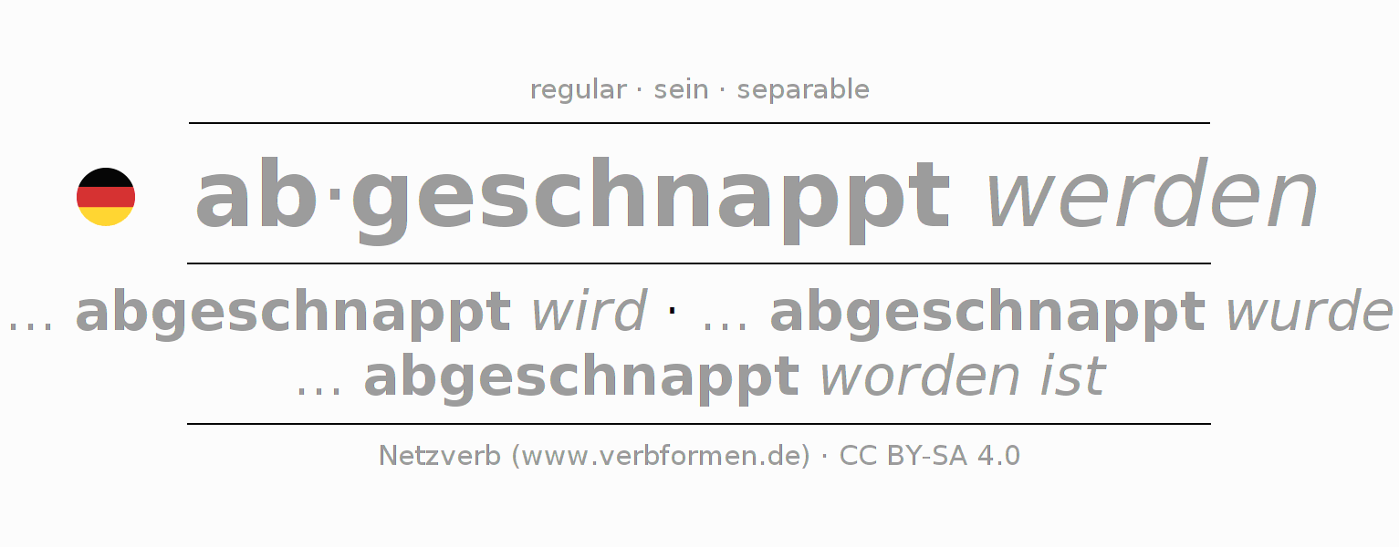 - Future Perfect: ... ich abgeschnappt worden sein werde, ... du abgeschnappt worden sein wirst, ... er abgeschnappt worden sein wird, ... wir abgeschnappt worden sein werden, ... ihr abgeschnappt worden sein werdet, ... sie abgeschnappt worden sein werden