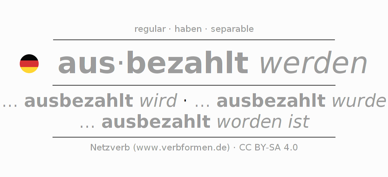Clear online presentation of the verb 'aus·bezahlt werden' including all verb forms. Therfore, the flection of the verb aus·bezahlt werden can be useful for homework, tests, exams, German lessons in school, learning German, during studies and adult education. Especially for people learning German it is essential to know the correct flection of a verb (... ausbezahlt wird - ... ausbezahlt wurde - ... ausbezahlt worden ist).