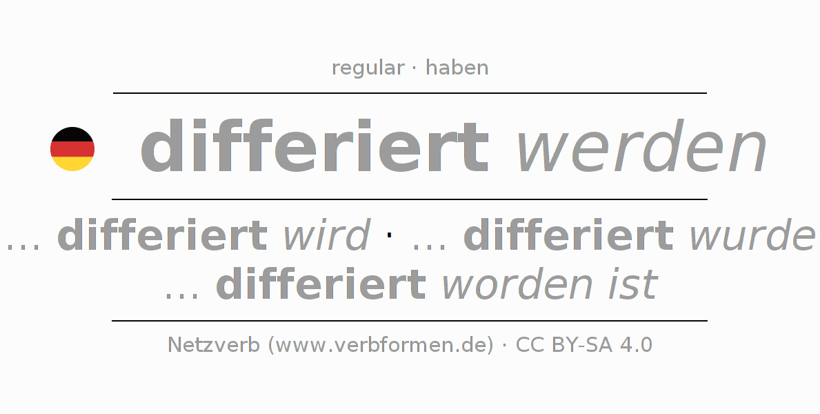 Clear online presentation of the verb 'differiert werden' including all verb forms. Therfore, the flection of the verb differiert werden can be useful for homework, tests, exams, German lessons in school, learning German, during studies and adult education. Especially for people learning German it is essential to know the correct flection of a verb (... differiert wird - ... differiert wurde - ... differiert worden ist).
