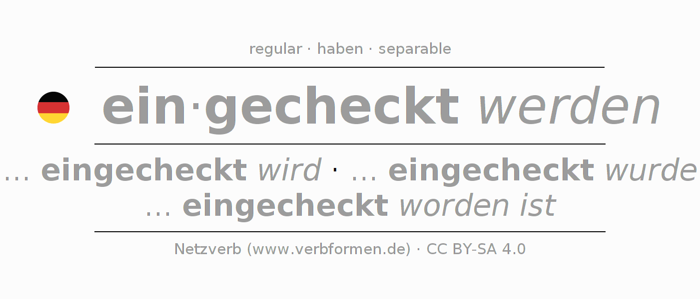 Clear online presentation of the verb 'ein·gecheckt werden' including all verb forms. Therfore, the flection of the verb ein·gecheckt werden can be useful for homework, tests, exams, German lessons in school, learning German, during studies and adult education. Especially for people learning German it is essential to know the correct flection of a verb (... eingecheckt wird - ... eingecheckt wurde - ... eingecheckt worden ist).