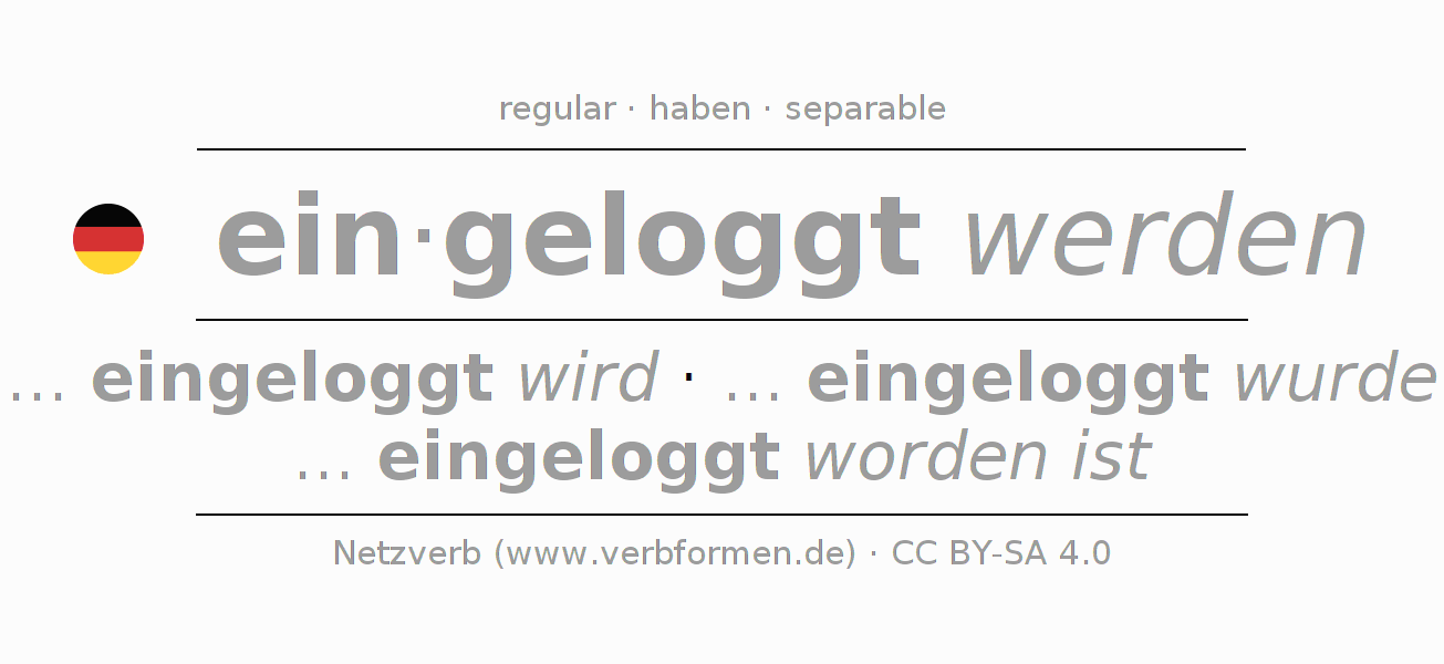 Clear online presentation of the verb 'ein·geloggt werden' including all verb forms. Therfore, the flection of the verb ein·geloggt werden can be useful for homework, tests, exams, German lessons in school, learning German, during studies and adult education. Especially for people learning German it is essential to know the correct flection of a verb (... eingeloggt wird - ... eingeloggt wurde - ... eingeloggt worden ist).