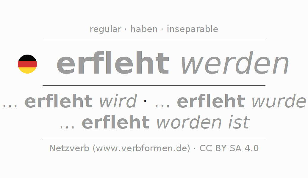 - Future Perfect: ... ich erfleht worden sein werde, ... du erfleht worden sein wirst, ... er erfleht worden sein wird, ... wir erfleht worden sein werden, ... ihr erfleht worden sein werdet, ... sie erfleht worden sein werden