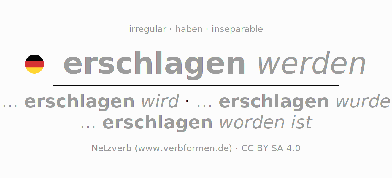 Clear online presentation of the verb 'erschlagen werden' including all verb forms. Therfore, the flection of the verb erschlagen werden can be useful for homework, tests, exams, German lessons in school, learning German, during studies and adult education. Especially for people learning German it is essential to know the correct flection of a verb (... erschlagen wird - ... erschlagen wurde - ... erschlagen worden ist).