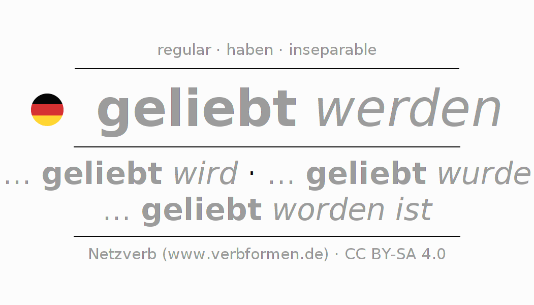 Clear online presentation of the verb 'geliebt werden' including all verb forms. Therfore, the flection of the verb geliebt werden can be useful for homework, tests, exams, German lessons in school, learning German, during studies and adult education. Especially for people learning German it is essential to know the correct flection of a verb (... geliebt wird - ... geliebt wurde - ... geliebt worden ist).