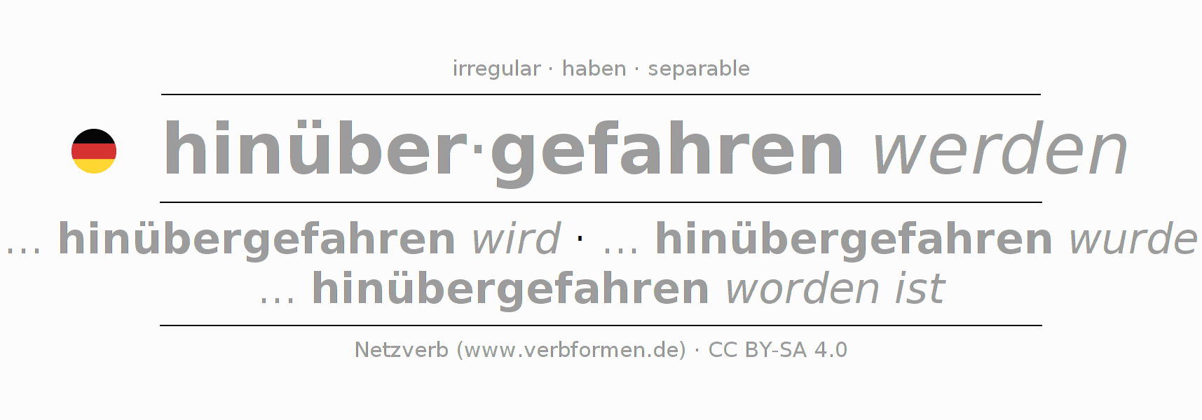 - Perfect: ... ich hinübergefahren worden bin, ... du hinübergefahren worden bist, ... er hinübergefahren worden ist, ... wir hinübergefahren worden sind, ... ihr hinübergefahren worden seid, ... sie hinübergefahren worden sind