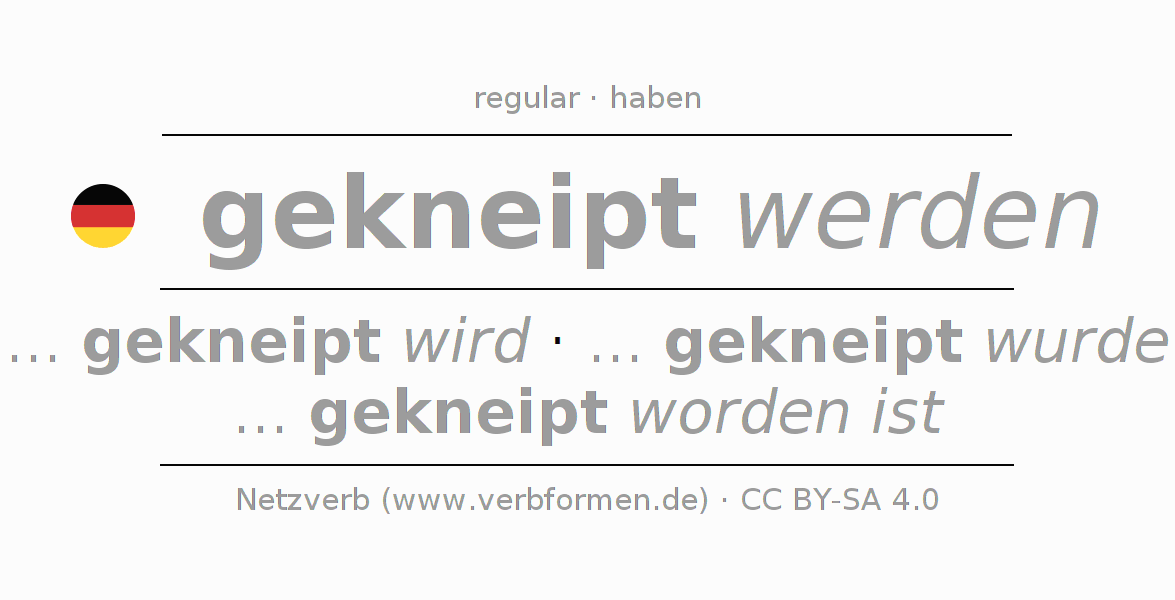 - Present: ... ich gekneipt werde, ... du gekneipt wirst, ... er gekneipt wird, ... wir gekneipt werden, ... ihr gekneipt werdet, ... sie gekneipt werden