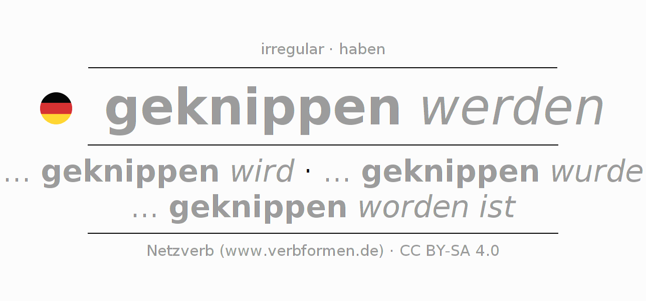 - Present: ... ich geknippen werde, ... du geknippen wirst, ... er geknippen wird, ... wir geknippen werden, ... ihr geknippen werdet, ... sie geknippen werden