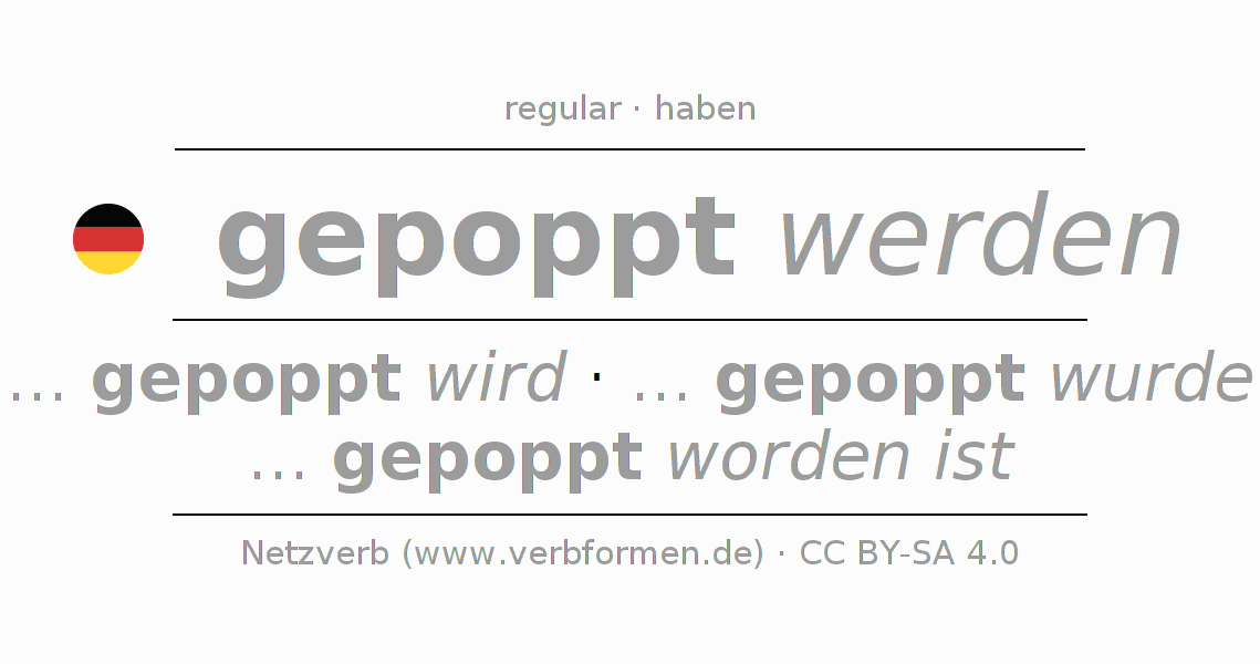 Clear online presentation of the verb 'gepoppt werden' including all verb forms. Therfore, the flection of the verb gepoppt werden can be useful for homework, tests, exams, German lessons in school, learning German, during studies and adult education. Especially for people learning German it is essential to know the correct flection of a verb (... gepoppt wird - ... gepoppt wurde - ... gepoppt worden ist).