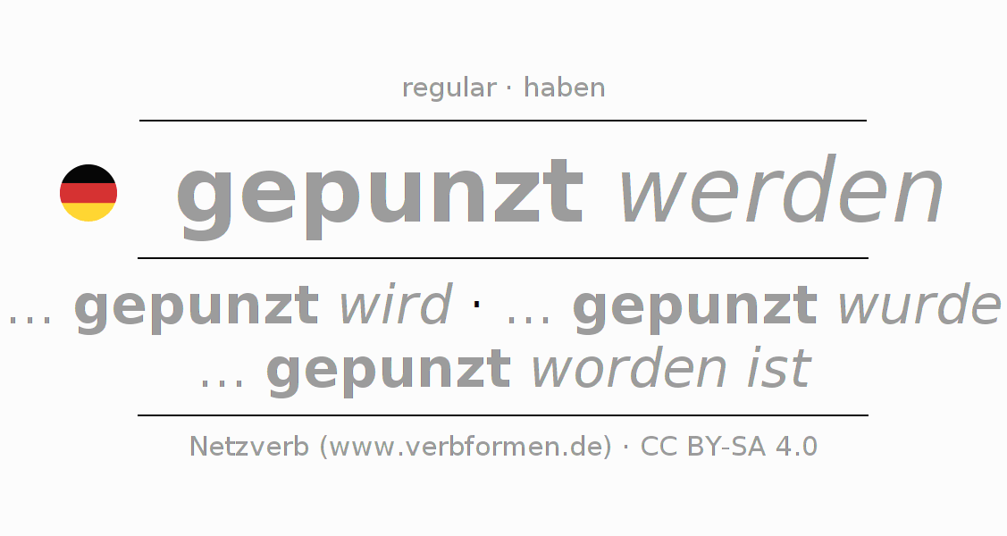 - Future Perfect: ... ich gepunzt worden sein werde, ... du gepunzt worden sein werdest, ... er gepunzt worden sein werde, ... wir gepunzt worden sein werden, ... ihr gepunzt worden sein werdet, ... sie gepunzt worden sein werden