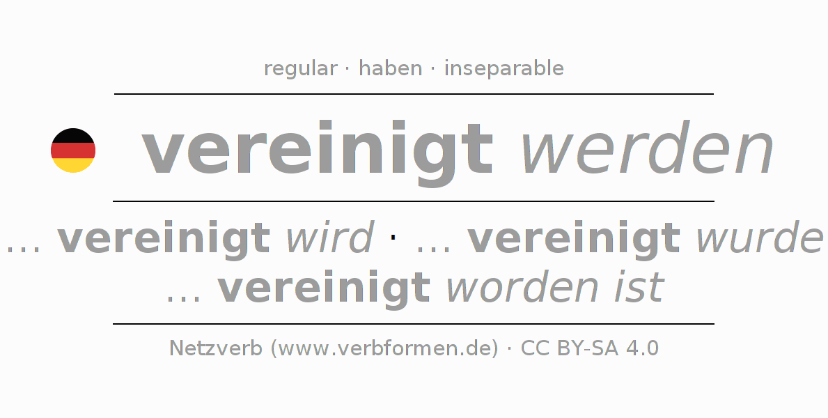Clear online presentation of the verb 'vereinigt werden' including all verb forms. Therfore, the flection of the verb vereinigt werden can be useful for homework, tests, exams, German lessons in school, learning German, during studies and adult education. Especially for people learning German it is essential to know the correct flection of a verb (... vereinigt wird - ... vereinigt wurde - ... vereinigt worden ist).