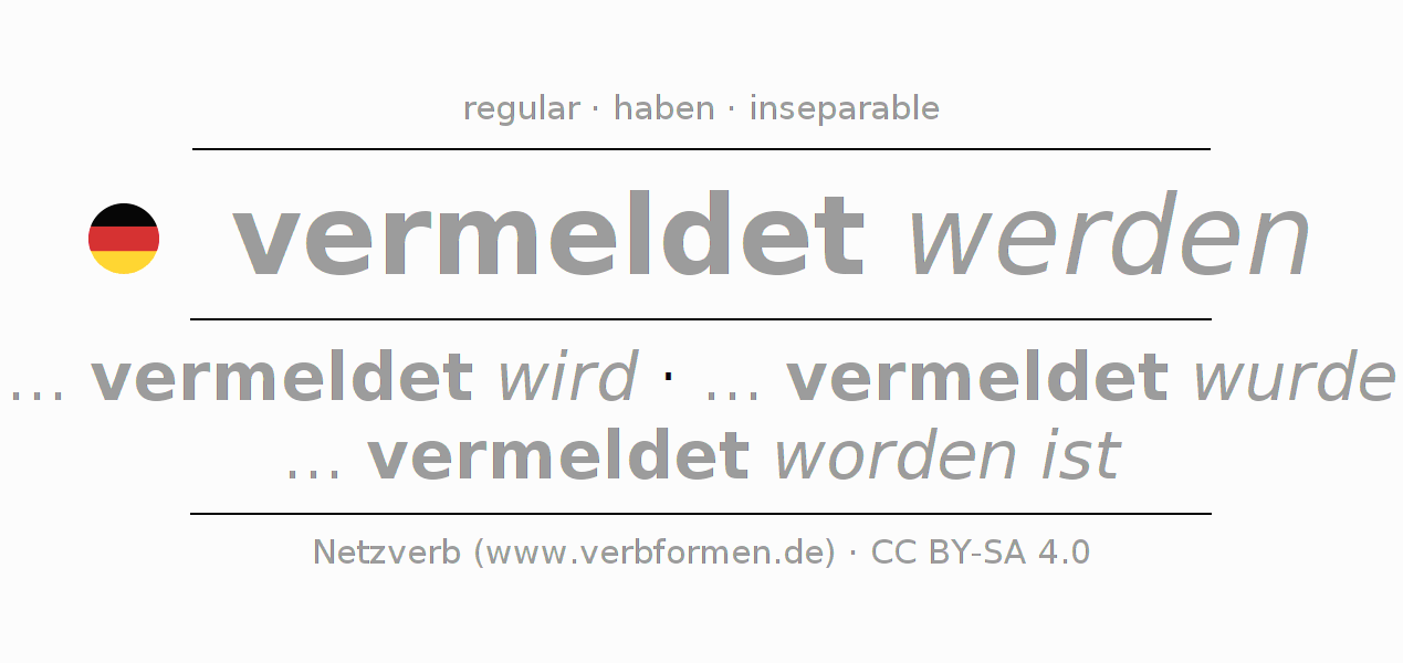 Clear online presentation of the verb 'vermeldet werden' including all verb forms. Therfore, the flection of the verb vermeldet werden can be useful for homework, tests, exams, German lessons in school, learning German, during studies and adult education. Especially for people learning German it is essential to know the correct flection of a verb (... vermeldet wird - ... vermeldet wurde - ... vermeldet worden ist).