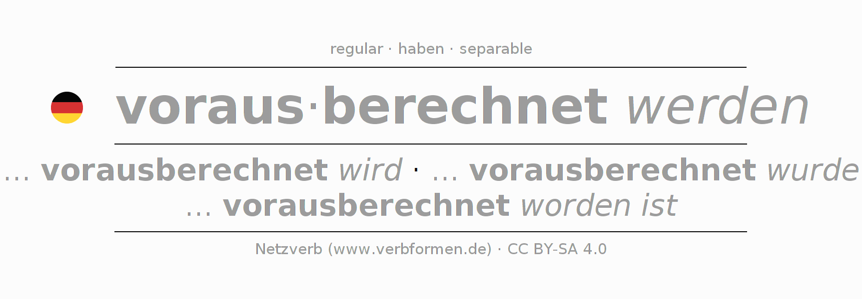 - Present: ... ich vorausberechnet werde, ... du vorausberechnet wirst, ... er vorausberechnet wird, ... wir vorausberechnet werden, ... ihr vorausberechnet werdet, ... sie vorausberechnet werden
