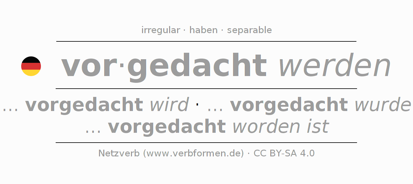 - Future Perfect: ... ich vorgedacht worden sein werde, ... du vorgedacht worden sein wirst, ... er vorgedacht worden sein wird, ... wir vorgedacht worden sein werden, ... ihr vorgedacht worden sein werdet, ... sie vorgedacht worden sein werden