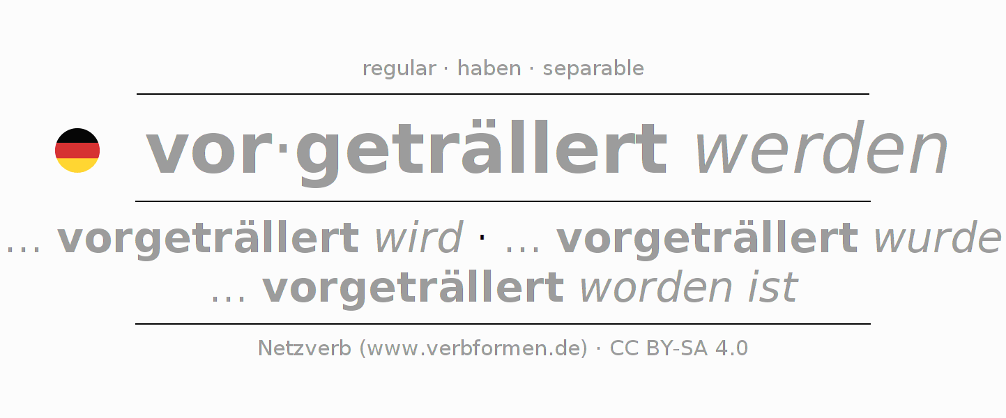 - Present: ... ich vorgeträllert werde, ... du vorgeträllert wirst, ... er vorgeträllert wird, ... wir vorgeträllert werden, ... ihr vorgeträllert werdet, ... sie vorgeträllert werden