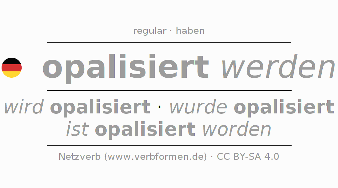 - Perfect: ich bin opalisiert worden, du bist opalisiert worden, er ist opalisiert worden, wir sind opalisiert worden, ihr seid opalisiert worden, sie sind opalisiert worden