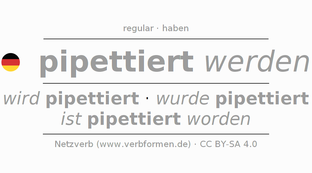 Clear online presentation of the verb 'pipettiert werden' including all verb forms. Therfore, the flection of the verb pipettiert werden can be useful for homework, tests, exams, German lessons in school, learning German, during studies and adult education. Especially for people learning German it is essential to know the correct flection of a verb (wird pipettiert - wurde pipettiert - ist pipettiert worden).
