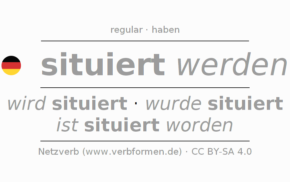 Clear online presentation of the verb 'situiert werden' including all verb forms. Therfore, the flection of the verb situiert werden can be useful for homework, tests, exams, German lessons in school, learning German, during studies and adult education. Especially for people learning German it is essential to know the correct flection of a verb (wird situiert - wurde situiert - ist situiert worden).