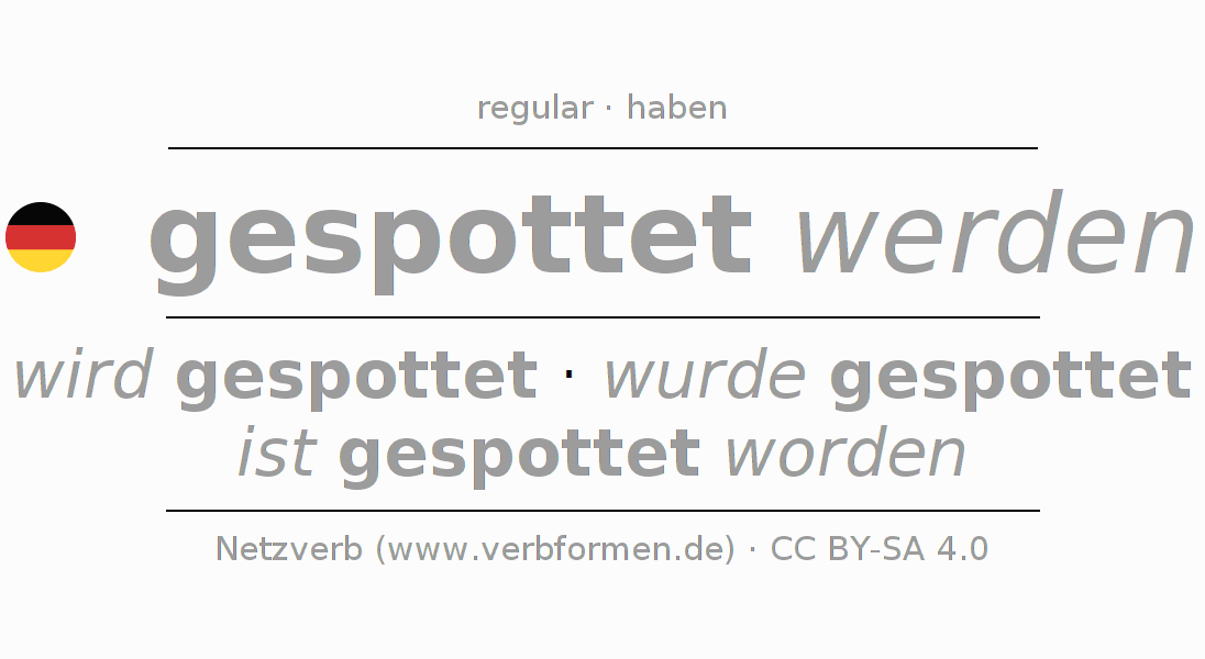 - Present: ich werde gespottet, du wirst gespottet, er wird gespottet, wir werden gespottet, ihr werdet gespottet, sie werden gespottet