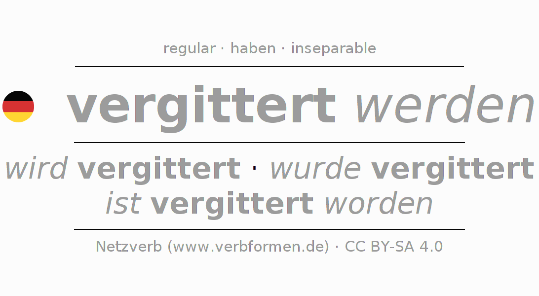 Clear online presentation of the verb 'vergittert werden' including all verb forms. Therfore, the flection of the verb vergittert werden can be useful for homework, tests, exams, German lessons in school, learning German, during studies and adult education. Especially for people learning German it is essential to know the correct flection of a verb (wird vergittert - wurde vergittert - ist vergittert worden).