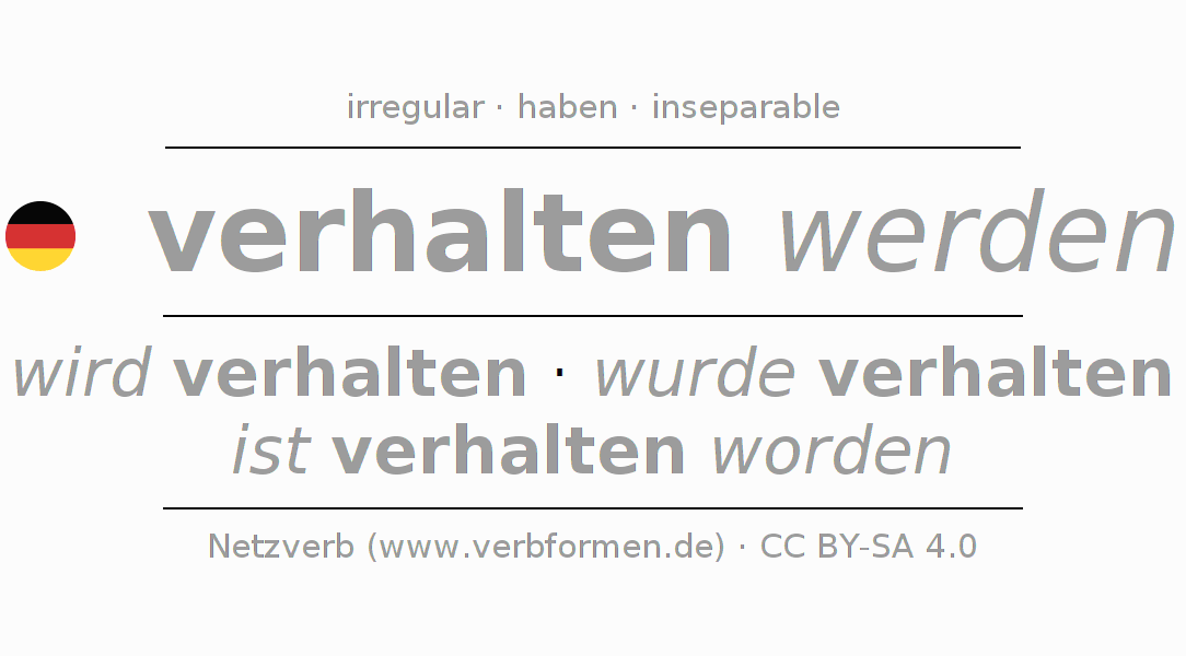 Clear online presentation of the verb 'verhalten werden' including all verb forms. Therfore, the flection of the verb verhalten werden can be useful for homework, tests, exams, German lessons in school, learning German, during studies and adult education. Especially for people learning German it is essential to know the correct flection of a verb (wird verhalten - wurde verhalten - ist verhalten worden).