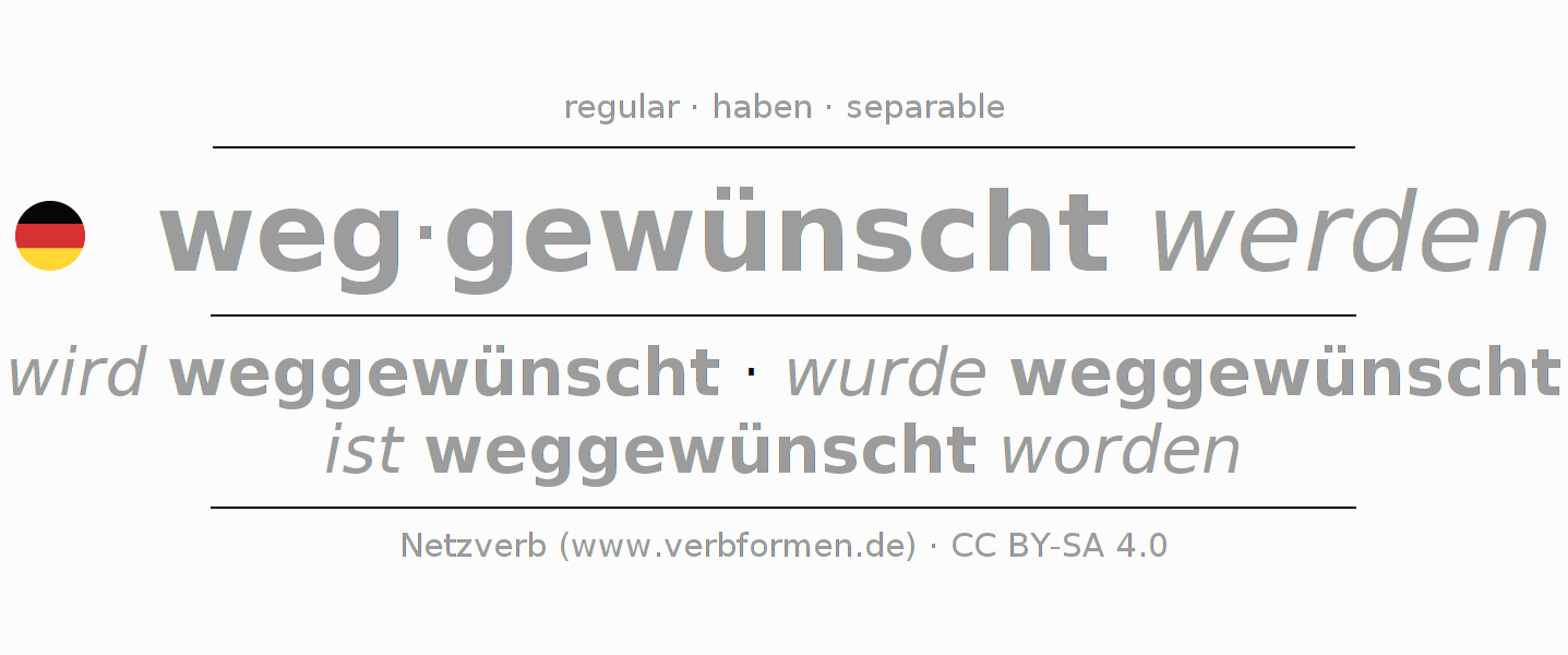 Clear online presentation of the verb 'weg·gewünscht werden' including all verb forms. Therfore, the flection of the verb weg·gewünscht werden can be useful for homework, tests, exams, German lessons in school, learning German, during studies and adult education. Especially for people learning German it is essential to know the correct flection of a verb (wird weggewünscht - wurde weggewünscht - ist weggewünscht worden).