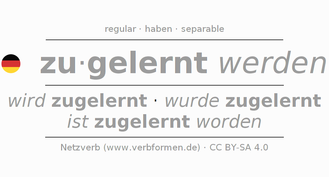 - Future: ich werde zugelernt werden, du wirst zugelernt werden, er wird zugelernt werden, wir werden zugelernt werden, ihr werdet zugelernt werden, sie werden zugelernt werden