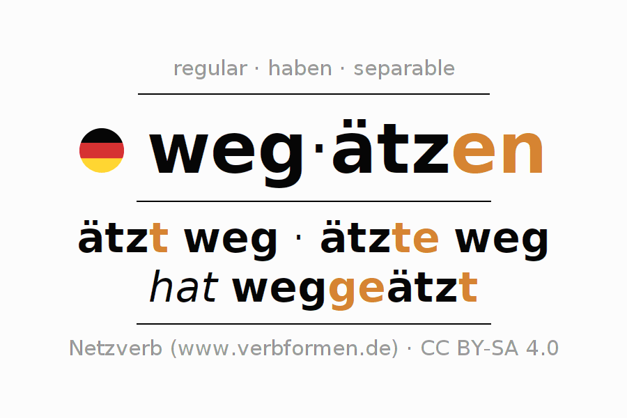 - Future: ich werde wegätzen, du wirst wegätzen, er wird wegätzen, wir werden wegätzen, ihr werdet wegätzen, sie werden wegätzen