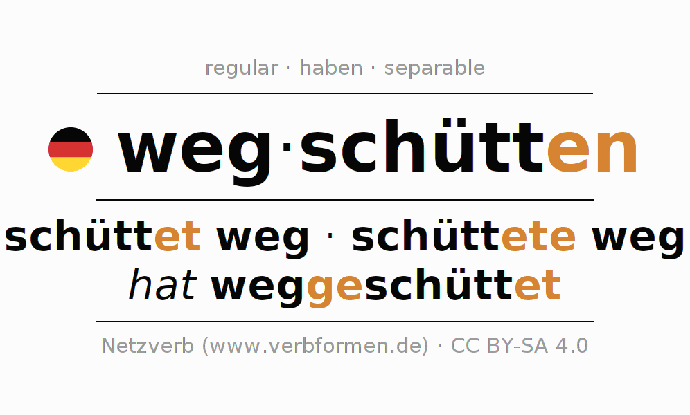 - Future: ich werde wegschütten, du wirst wegschütten, er wird wegschütten, wir werden wegschütten, ihr werdet wegschütten, sie werden wegschütten