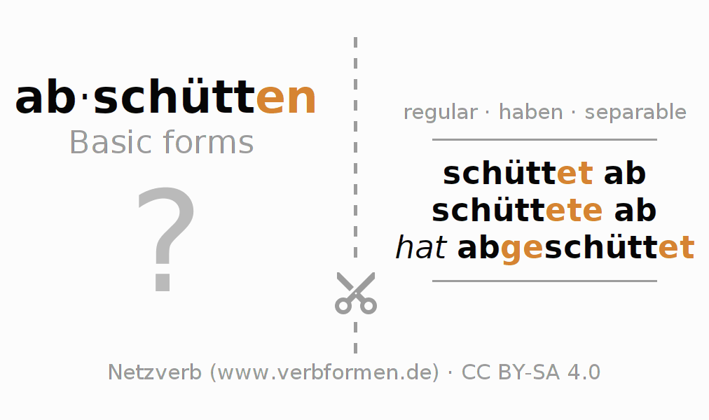 Worksheets are used generally for the conjugation of the verb abschütten in teaching. The materials can be used as Open Educational Resources (OER) for exercises, for games and as Tasks (CC BY-SA 4.0). There are many different types of tasks available for the verb abschütten. These are overview sheets with complete conjugation, puzzles and games that require joint learning. The entire educational material is available for free as a PDF download, as pictures and as an interactive browser version. In addition to the tasks, countless examples for abschütten also provide an aid to using the verb.