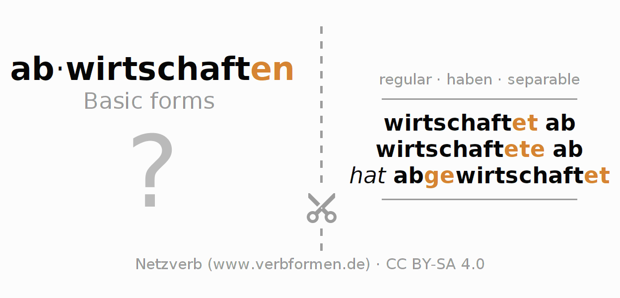 Worksheets are used generally for the conjugation of the verb abwirtschaften in teaching. The materials can be used as Open Educational Resources (OER) for exercises, for games and as Tasks (CC BY-SA 4.0). There are many different types of tasks available for the verb abwirtschaften. These are overview sheets with complete conjugation, puzzles and games that require joint learning. The entire educational material is available for free as a PDF download, as pictures and as an interactive browser version. In addition to the tasks, countless examples for abwirtschaften also provide an aid to using the verb.