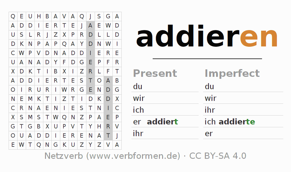 With these search word puzzles you can learn the conjugation of the German verb addieren.