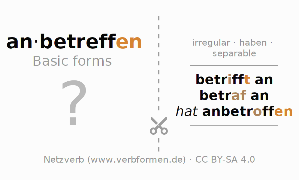 Worksheets are used generally for the conjugation of the verb anbetreffen in teaching. The materials can be used as Open Educational Resources (OER) for exercises, for games and as Tasks (CC BY-SA 4.0). There are many different types of tasks available for the verb anbetreffen. These are overview sheets with complete conjugation, puzzles and games that require joint learning. The entire educational material is available for free as a PDF download, as pictures and as an interactive browser version. In addition to the tasks, countless examples for anbetreffen also provide an aid to using the verb.