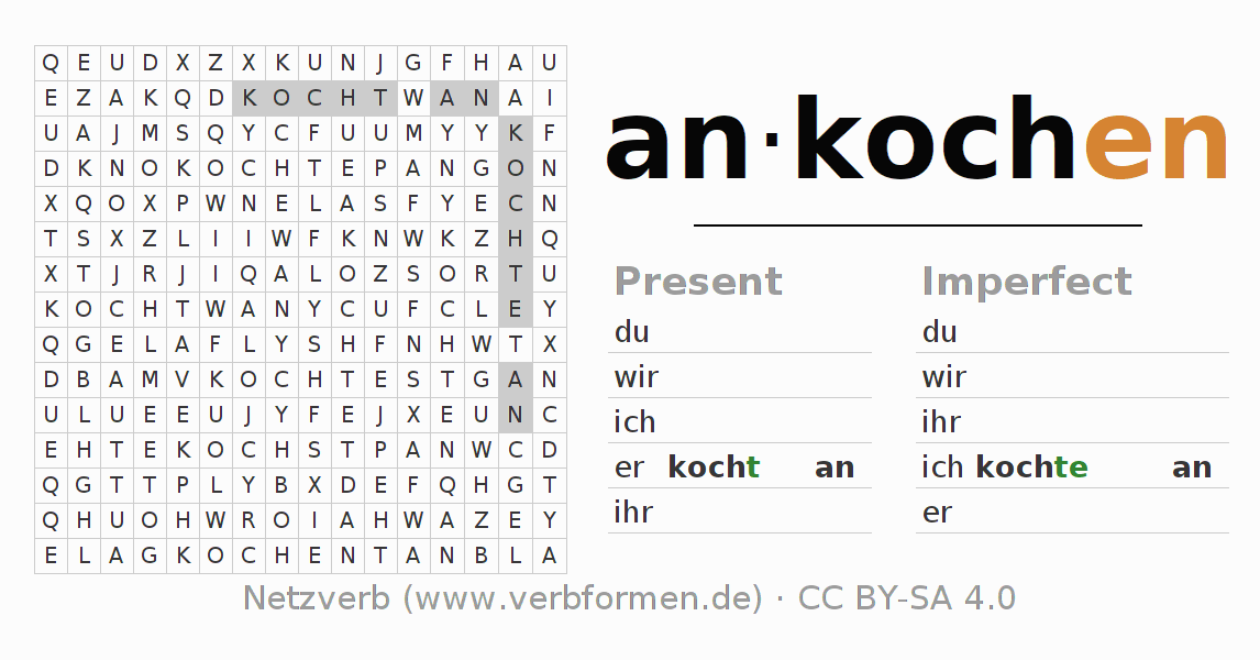 With these search word puzzles you can learn the conjugation of the German verb ankochen.