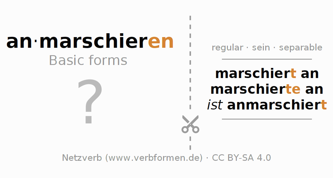 Worksheets are used generally for the conjugation of the verb anmarschieren in teaching. The materials can be used as Open Educational Resources (OER) for exercises, for games and as Tasks (CC BY-SA 4.0). There are many different types of tasks available for the verb anmarschieren. These are overview sheets with complete conjugation, puzzles and games that require joint learning. The entire educational material is available for free as a PDF download, as pictures and as an interactive browser version. In addition to the tasks, countless examples for anmarschieren also provide an aid to using the verb.