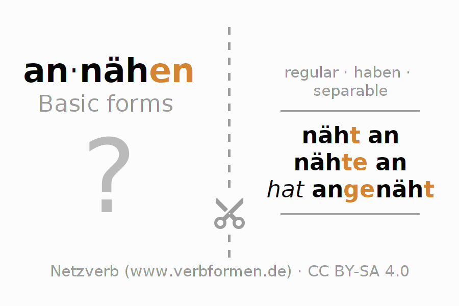 Worksheets are used generally for the conjugation of the verb annähen in teaching. The materials can be used as Open Educational Resources (OER) for exercises, for games and as Tasks (CC BY-SA 4.0). There are many different types of tasks available for the verb annähen. These are overview sheets with complete conjugation, puzzles and games that require joint learning. The entire educational material is available for free as a PDF download, as pictures and as an interactive browser version. In addition to the tasks, countless examples for annähen also provide an aid to using the verb.