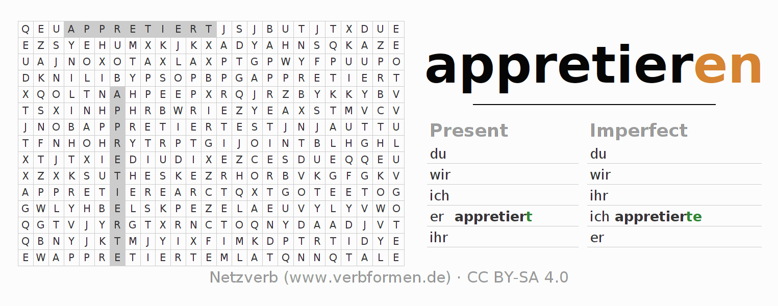 Worksheets are used generally for the conjugation of the verb appretieren in teaching. The materials can be used as Open Educational Resources (OER) for exercises, for games and as Tasks (CC BY-SA 4.0). There are many different types of tasks available for the verb appretieren. These are overview sheets with complete conjugation, puzzles and games that require joint learning. The entire educational material is available for free as a PDF download, as pictures and as an interactive browser version. In addition to the tasks, countless examples for appretieren also provide an aid to using the verb.