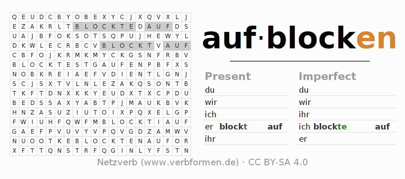 With these search word puzzles you can learn the conjugation of the German verb aufblocken.