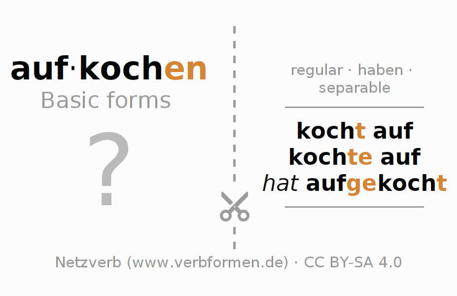 Worksheets are used generally for the conjugation of the verb aufkochen in teaching. The materials can be used as Open Educational Resources (OER) for exercises, for games and as Tasks (CC BY-SA 4.0). There are many different types of tasks available for the verb aufkochen. These are overview sheets with complete conjugation, puzzles and games that require joint learning. The entire educational material is available for free as a PDF download, as pictures and as an interactive browser version. In addition to the tasks, countless examples for aufkochen also provide an aid to using the verb.