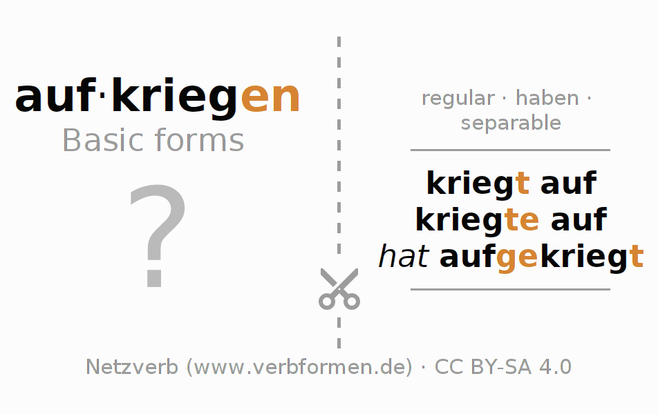 Worksheets are used generally for the conjugation of the verb aufkriegen in teaching. The materials can be used as Open Educational Resources (OER) for exercises, for games and as Tasks (CC BY-SA 4.0). There are many different types of tasks available for the verb aufkriegen. These are overview sheets with complete conjugation, puzzles and games that require joint learning. The entire educational material is available for free as a PDF download, as pictures and as an interactive browser version. In addition to the tasks, countless examples for aufkriegen also provide an aid to using the verb.