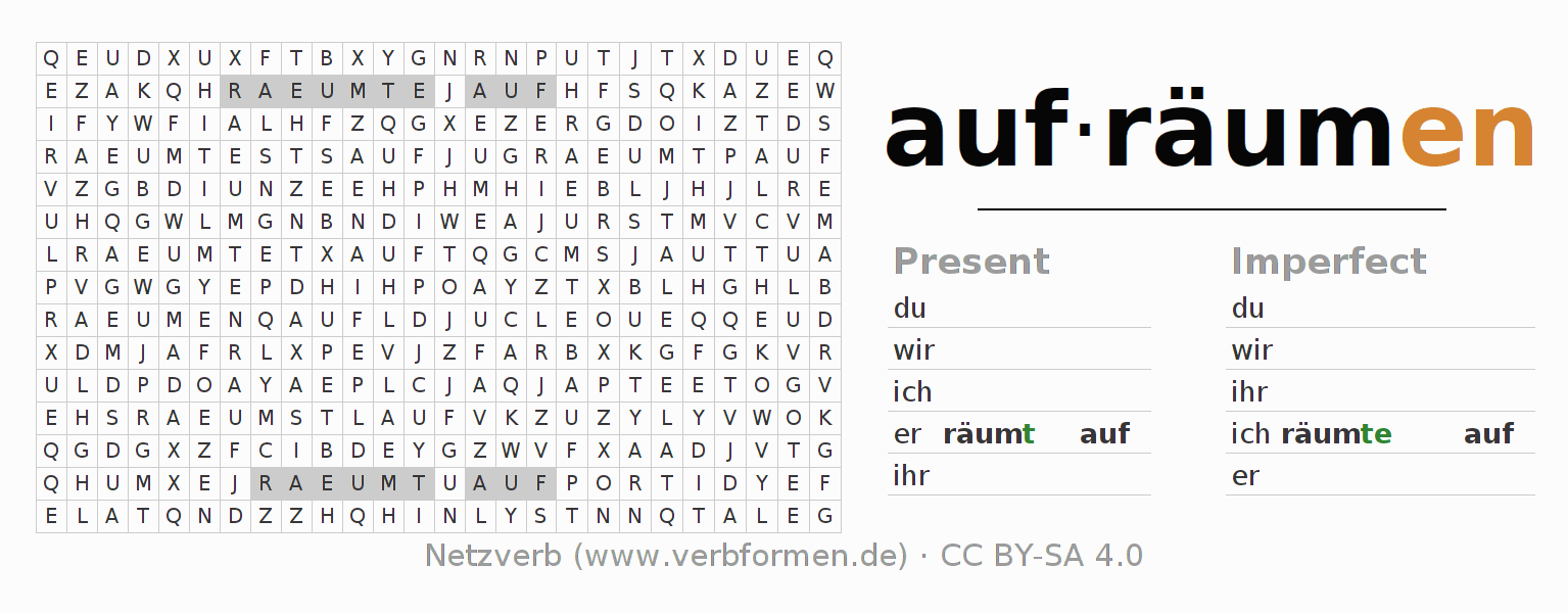 With these search word puzzles you can learn the conjugation of the German verb aufräumen.