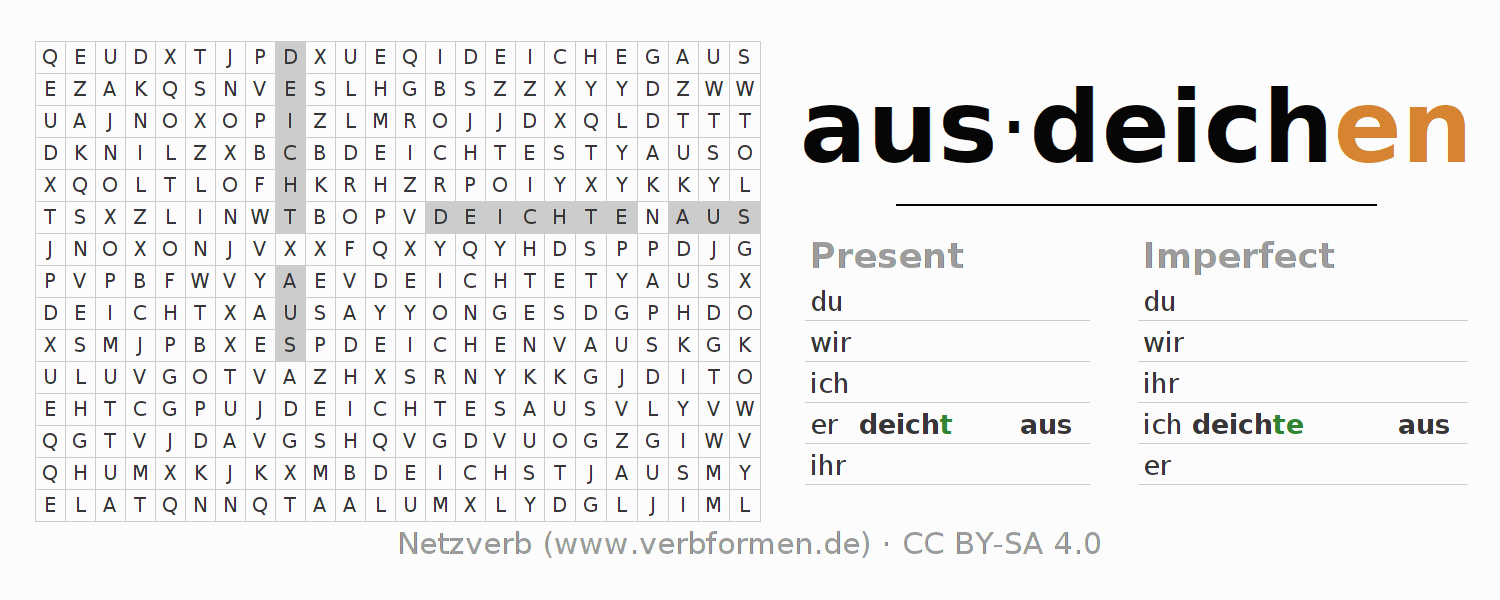 With these search word puzzles you can learn the conjugation of the German verb ausdeichen.