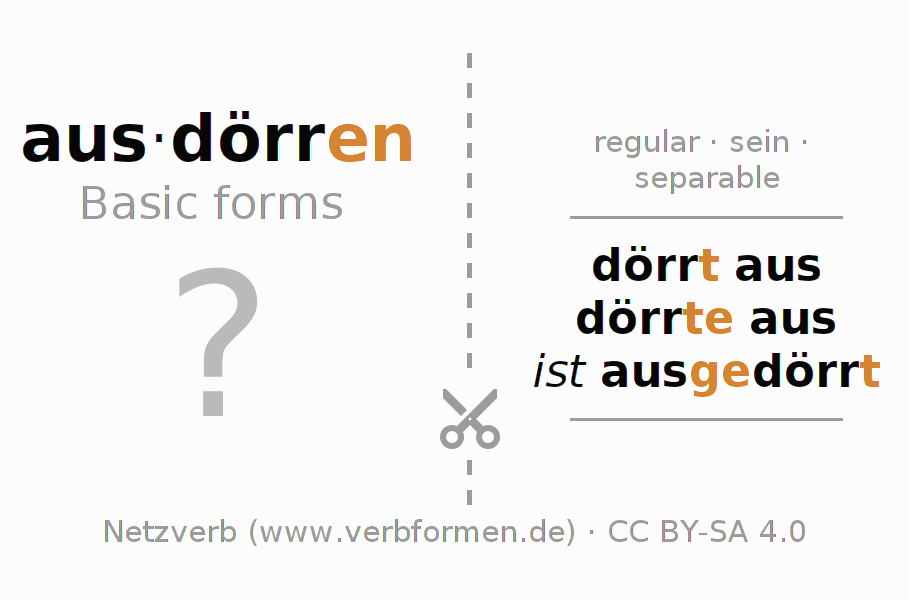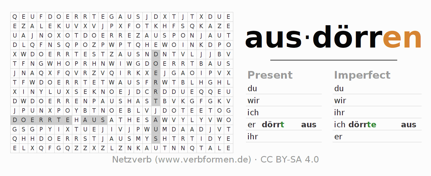 Worksheets are used generally for the conjugation of the verb ausdörren in teaching. The materials can be used as Open Educational Resources (OER) for exercises, for games and as Tasks (CC BY-SA 4.0). There are many different types of tasks available for the verb ausdörren (ist). These are overview sheets with complete conjugation, puzzles and games that require joint learning. The entire educational material is available for free as a PDF download, as pictures and as an interactive browser version. In addition to the tasks, countless examples for ausdörren also provide an aid to using the verb.