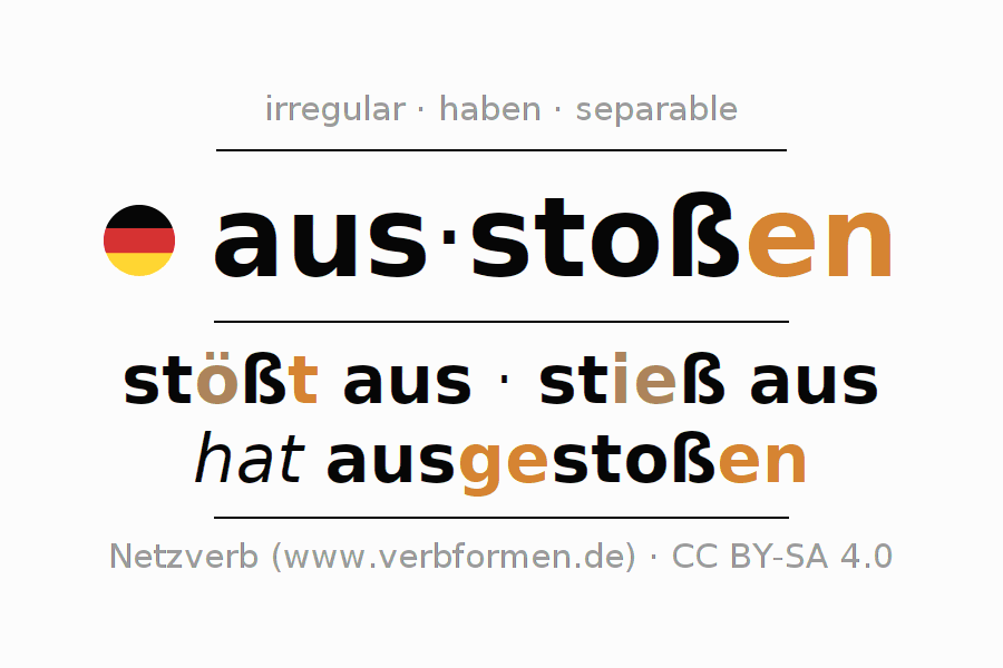 Worksheets are used generally for the conjugation of the verb ausstoßen in teaching. The materials can be used as Open Educational Resources (OER) for exercises, for games and as Tasks (CC BY-SA 4.0). There are many different types of tasks available for the verb ausstoßen. These are overview sheets with complete conjugation, puzzles and games that require joint learning. The entire educational material is available for free as a PDF download, as pictures and as an interactive browser version. In addition to the tasks, countless examples for ausstoßen also provide an aid to using the verb.