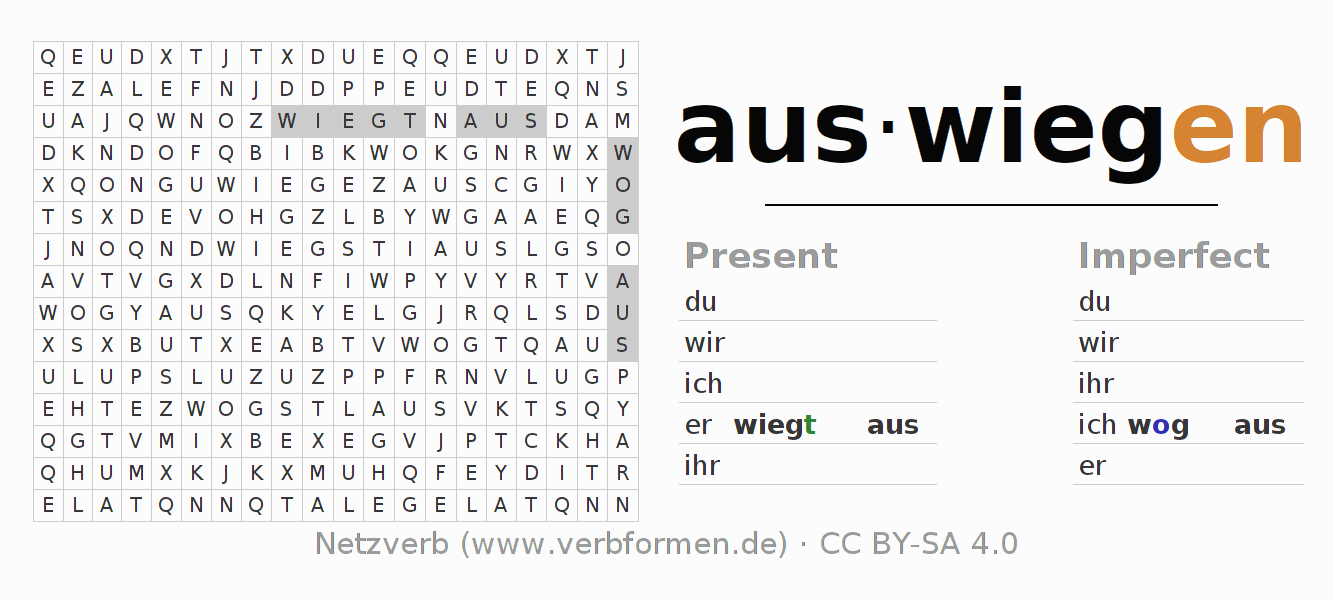 With these search word puzzles you can learn the conjugation of the German verb auswiegen.