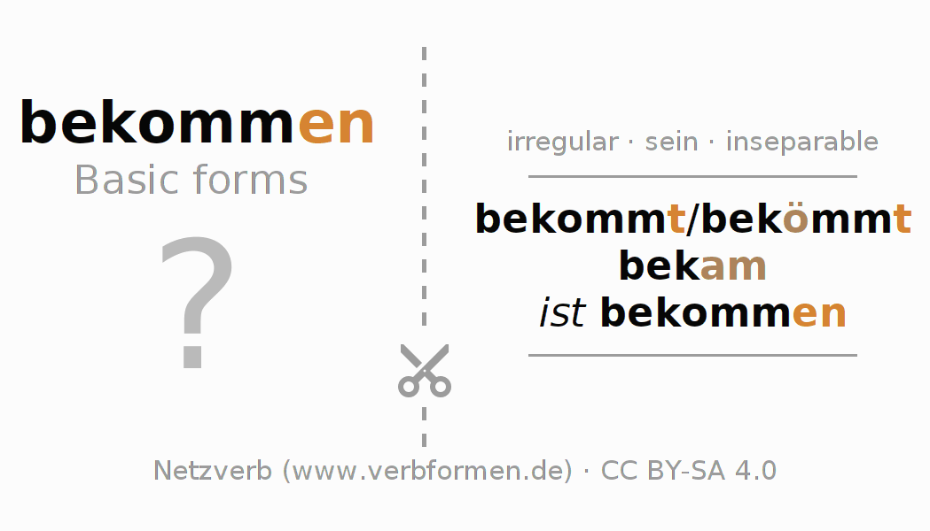 Worksheets are used generally for the conjugation of the verb bekommen in teaching. The materials can be used as Open Educational Resources (OER) for exercises, for games and as Tasks (CC BY-SA 4.0). There are many different types of tasks available for the verb bekommen (ist). These are overview sheets with complete conjugation, puzzles and games that require joint learning. The entire educational material is available for free as a PDF download, as pictures and as an interactive browser version. In addition to the tasks, countless examples for bekommen also provide an aid to using the verb.