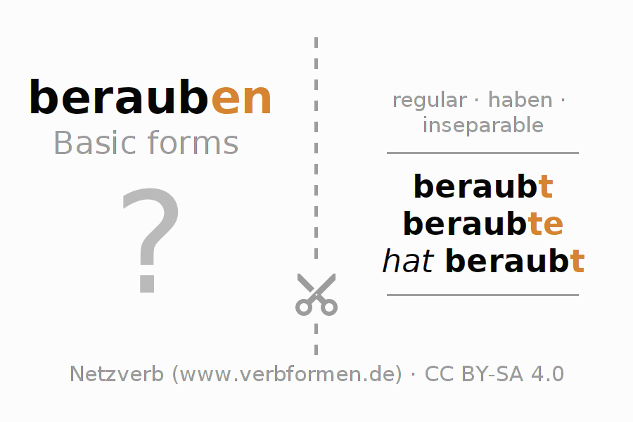 Worksheets are used generally for the conjugation of the verb berauben in teaching. The materials can be used as Open Educational Resources (OER) for exercises, for games and as Tasks (CC BY-SA 4.0). There are many different types of tasks available for the verb berauben. These are overview sheets with complete conjugation, puzzles and games that require joint learning. The entire educational material is available for free as a PDF download, as pictures and as an interactive browser version. In addition to the tasks, countless examples for berauben also provide an aid to using the verb.