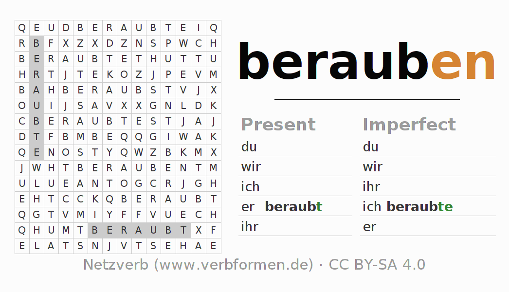 With these search word puzzles you can learn the conjugation of the German verb berauben.